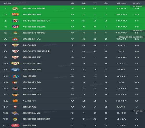 北京时间10月20日,西甲第9轮除了阿拉维斯和瓦伦西亚的比赛还没有进行,已经结束了9场比赛,我们一起看看最新积分榜变动!